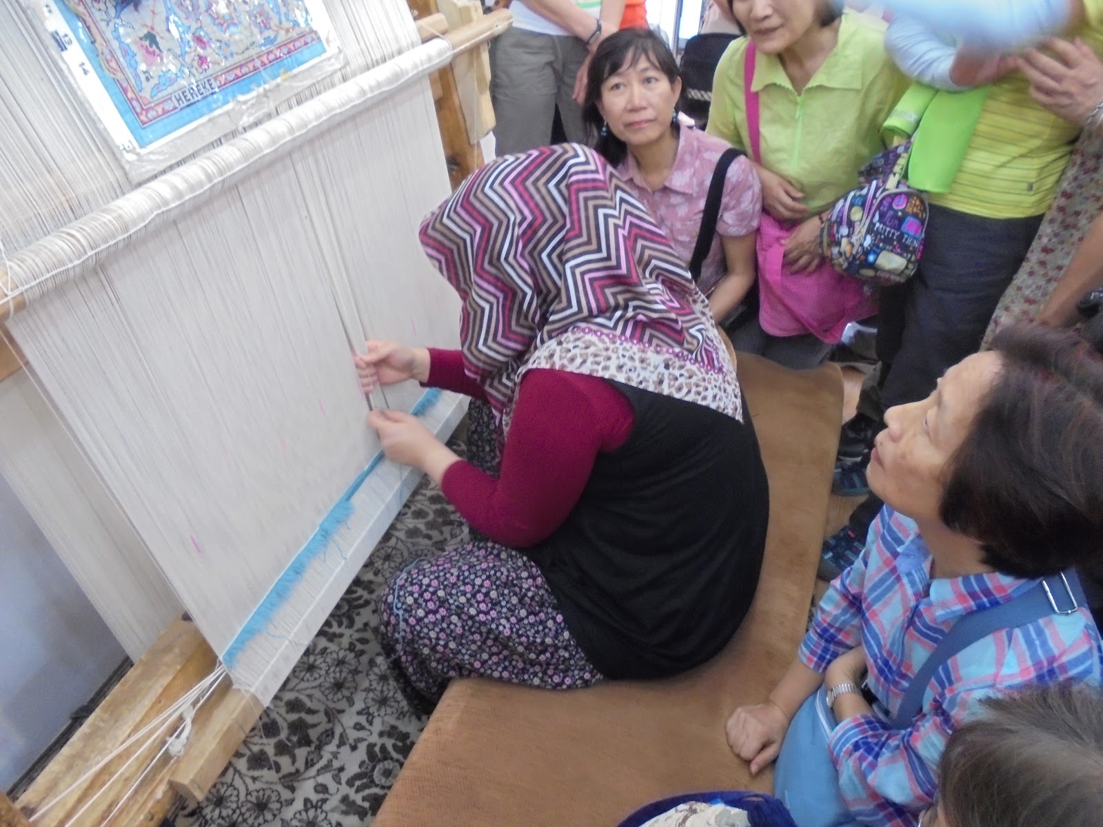 離開駱駝石,在車上愛國的辛南表示地毯製作是土耳其非常傳統且有長久歷史的家庭工業,屬純手工產品,現已由國家統籌管控,品質精良,值得推薦。於是下一站就是參訪地毯展售工廠,車行約半小時即抵達Golden Yarn Carpet展售工廠,先安排一場地毯製作解說,經由解說人員的說明,大致了解地毯的質料包括有羊毛、棉花及蠶絲,而土耳其的獨特織法為雙結織法,因此不會因一處勾傷即造成一整塊地毯全面支解,聽完說明後當然就是至展示間參觀商品了,但考慮智慧產權,此處不可攝影。展示的每件作品,花色圖樣非常精美,相同圖案由不同方向觀察,所呈現的深淺明亮度均不同,真讓人大開眼界,然當價格曝光後,大家都左顧右盼,看看有哪位老闆、老闆娘有興趣出手。解說人員特別表示每件作品皆是由一位織工獨力完成,有些耗時半年、一年,有些更需要兩年才得以完成,這就是造成價格不斐的主因,另外質料亦是重要因素,羊毛最廉,其次是棉,最貴的即屬蠶絲織品了。