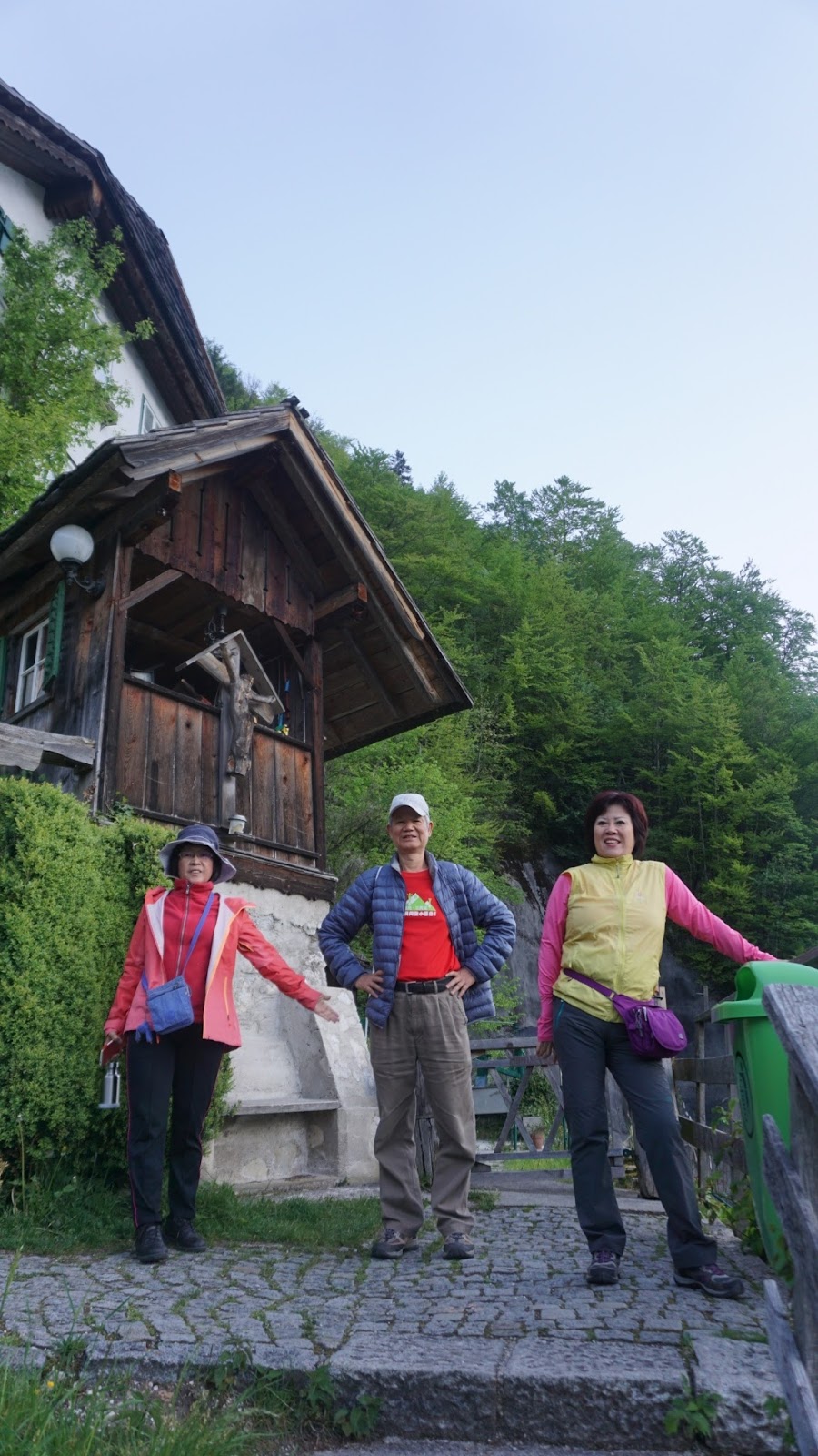 5/9 依據昨晚已約定的時間,清晨五點半來到德隆會長下榻的古堡集合,此時月波夫婦已在作晨操,我們也利用等待時段順便暖身一下,哈斯達特的清晨好清新,溫度約7℃,近六點完成集合,有些鶴友還有點睡眼惺忪,時間有限,必須在早餐前趕回餐廳,十一位樂山的鶴友立即開拔,我們沿著「之」字形山徑精神抖擻的一路往上,路旁山坡種植的高挺林木守護著哈斯達特陡峭山坡,更守護著下方這沉靜美麗的山城,約半個多小時後全員都陸續來到山頂的空中景觀台,由空中俯視尚在沉睡的哈斯達特靜靜地依偎在平靜的大湖邊,是如此的迷你!如此的可愛!但這座突出岩壁懸空的景觀台卻也讓人有些怯步。今晨這趟加碼行程正好也完成昨天在聖沃夫岡湖畔的幻想,彌補了無法登上山頂一覽大湖全景的遺憾。 一償昨日心願後,當然也要為野鶴十一位健腳完成登上哈斯達特空中景觀台留下印證,拉開德隆會長事先準備好的「台北閒雲野鶴」紅布條,在喀嚓聲中為大家留下珍貴的回憶。完成任務後我們就開始迅速下山,此時映入眼簾的就是正在晨曦中甦醒的哈斯達特,山徑旁許多色彩繽紛的小野花也在晨曦中冒出頭來,似乎在跟我們這群遠到的貴客道早安。途中肚子已經咕嚕咕嚕的叫,大家三步當作兩步趕,終於在用餐時間,準時踏入了餐廳,美食當前趕快孝敬飢腸轆轆的五臟廟。